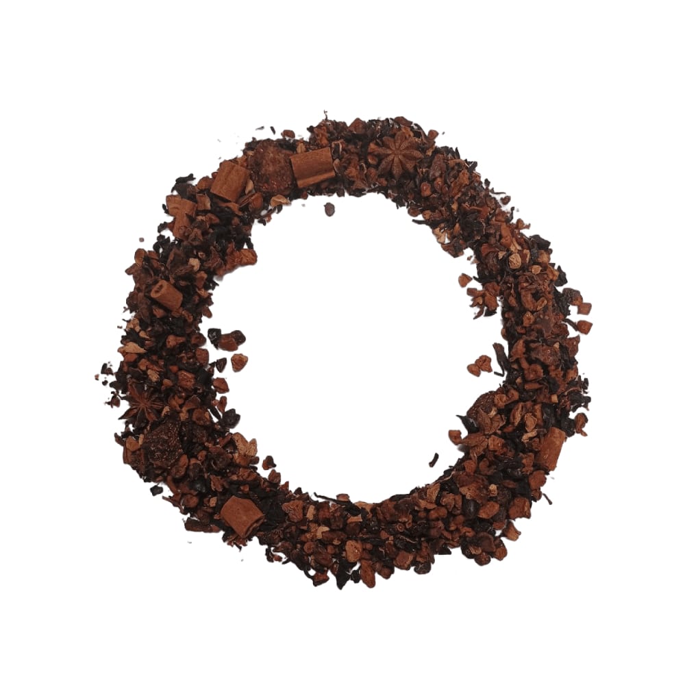 Ingredientes: Trozos de manzana, fresas, canela, anís estrella, jengibre, pimienta rosa, clavo, pétalos de rosa y jamaica.