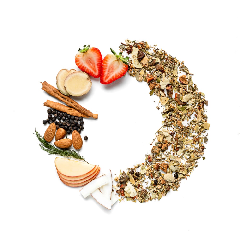 Ingredientes: Coco, hojas de fresa, flor de tilo, trozos de manzana, semillas de hinojo, trozos de jengibre, almendras, canela y granos de pimienta.