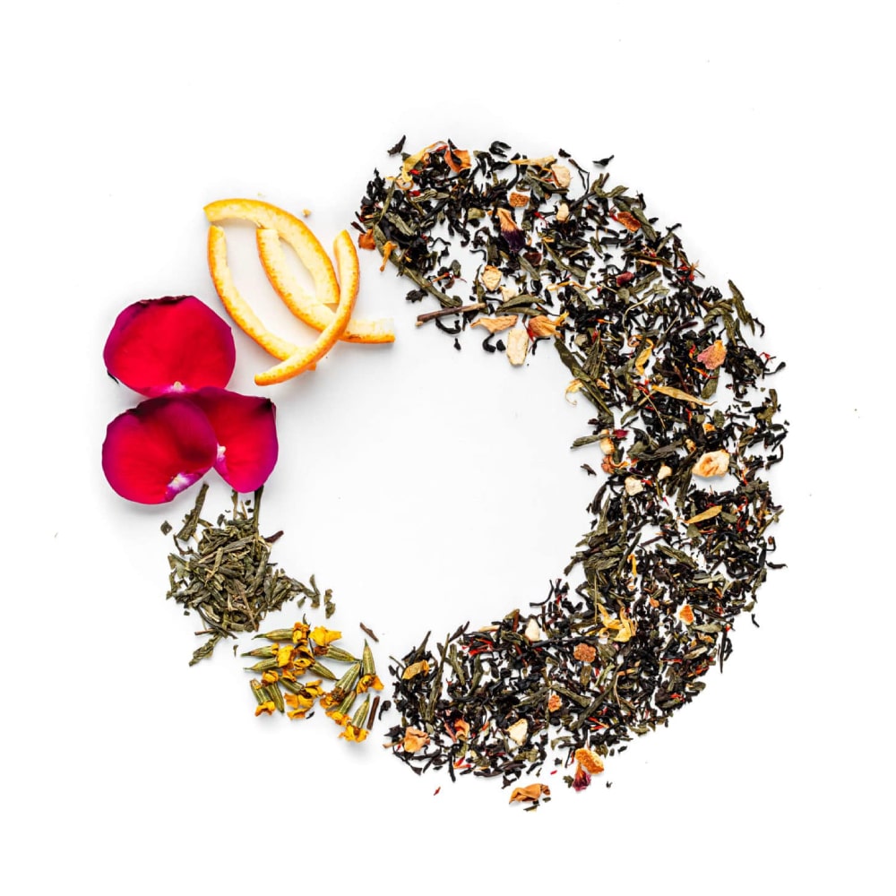 Ingredientes: Té negro, té verde, cáscaras de naranja, pétalos de rosa, cártamo, hojas de caléndula.