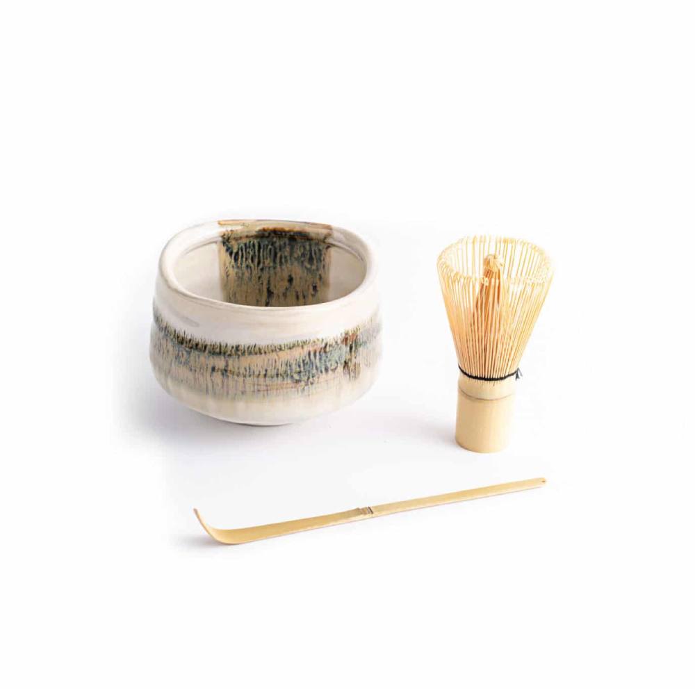 - Compuesto por: Chawan (taza para té), Chasen (batidor bambú) y Chasaku (medidora de bambú para matcha)