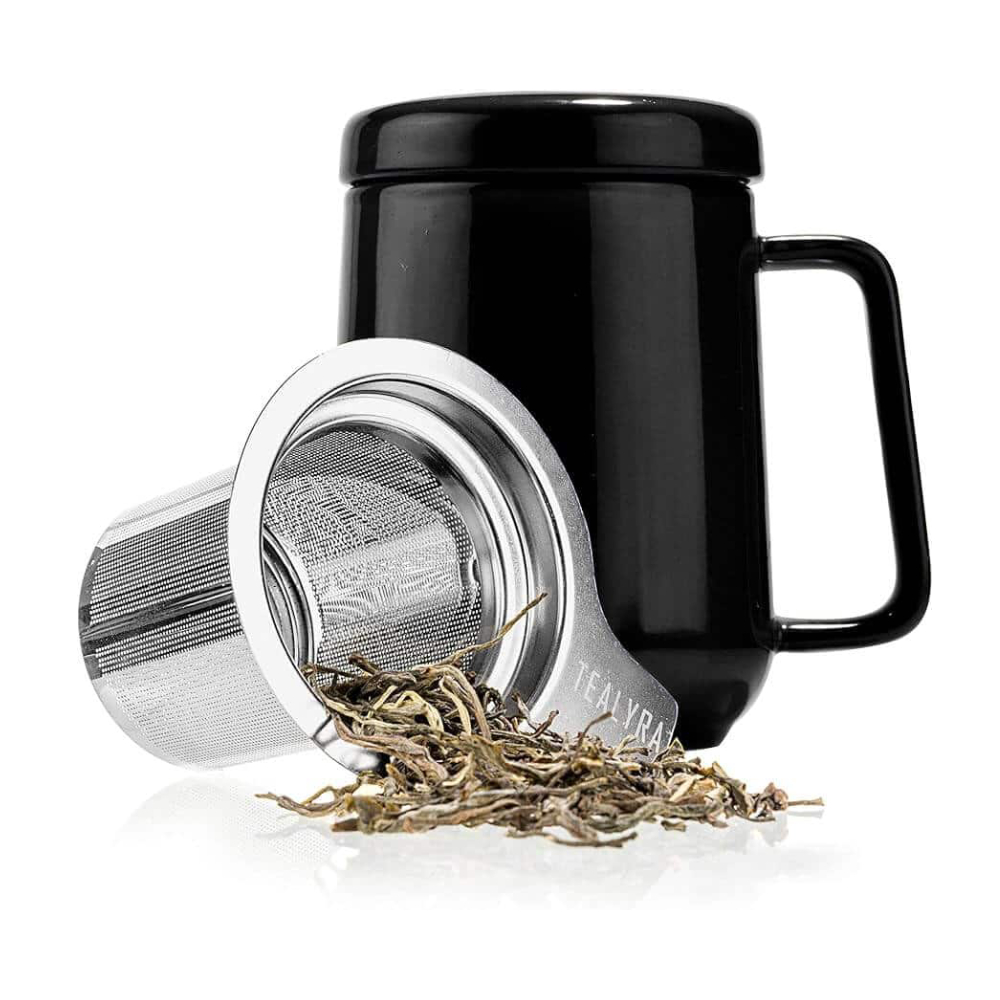 Disfrutá tu té favorito con estilo en la Taza Cerámica Peak Negra. Incluye infusor de acero inoxidable y tapa, perfecta para preparar infusiones con comodidad. Disponible en Costa Rica.